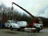 Unser Klebstofftest mit einem Käfer am Haken eines Kranfahrzeugs